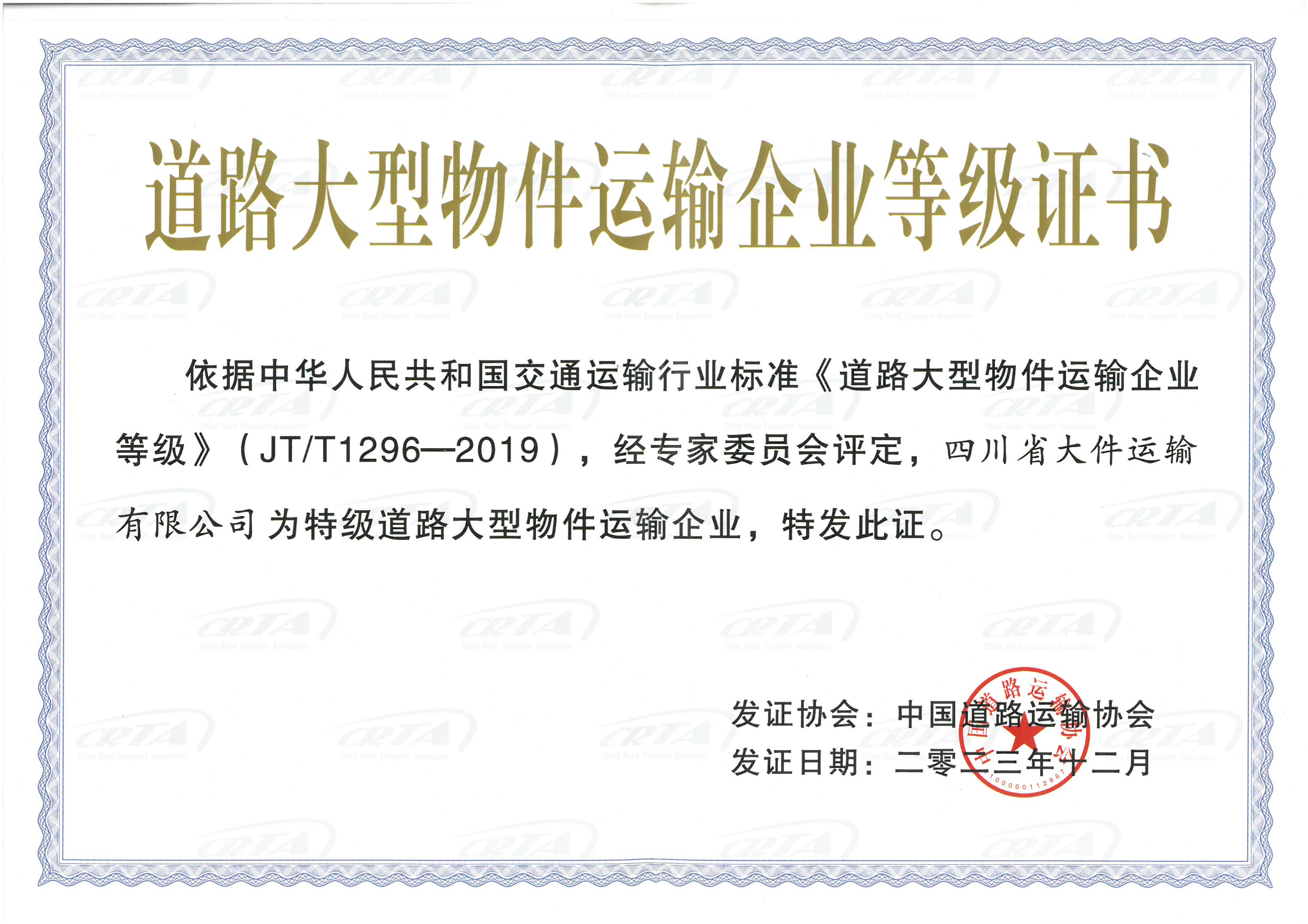 道路大型物件运输企业等级证书