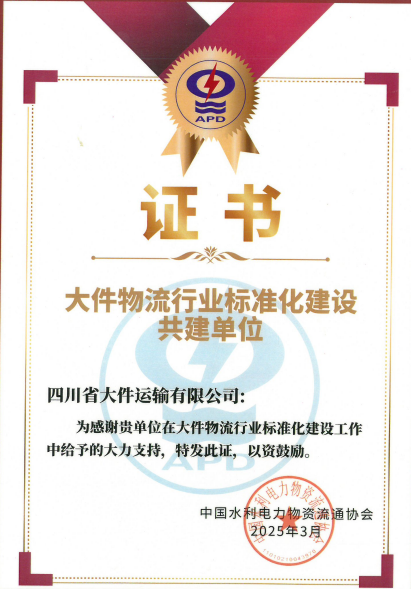 大件物流行业标准化建设共建单位证书