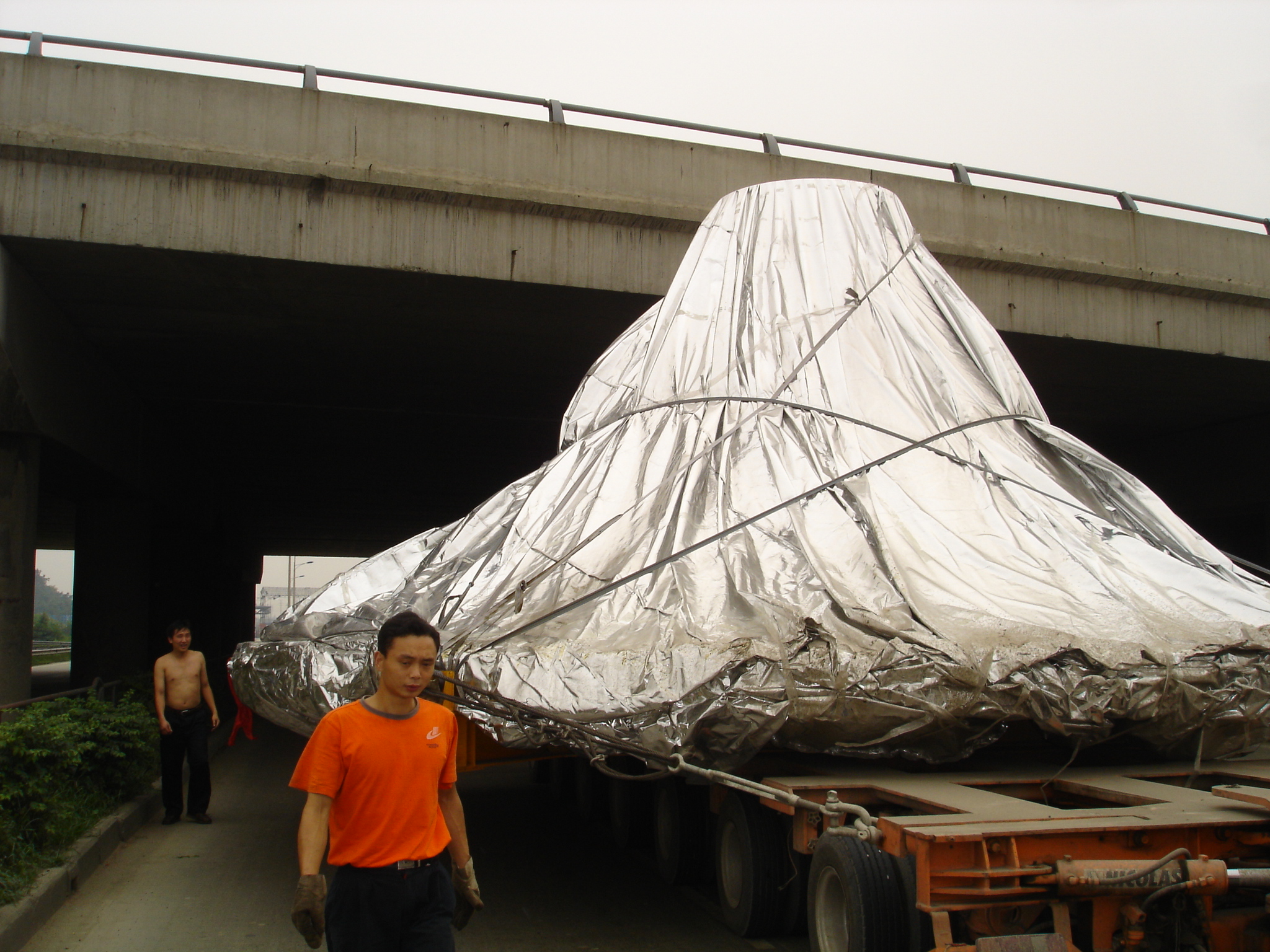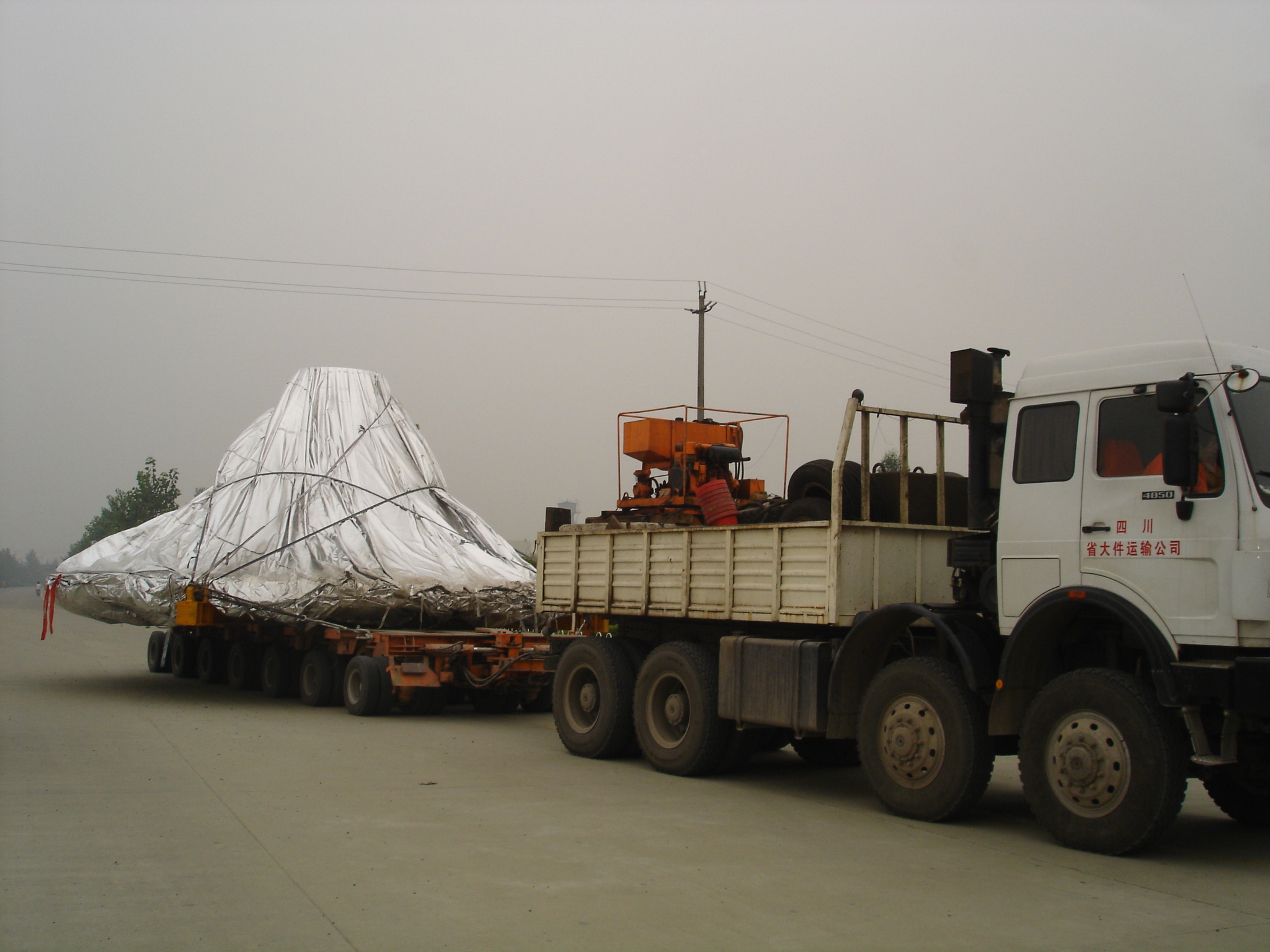 三峡水轮机转轮上冠装车运输,重109.72吨,宽8.46米。