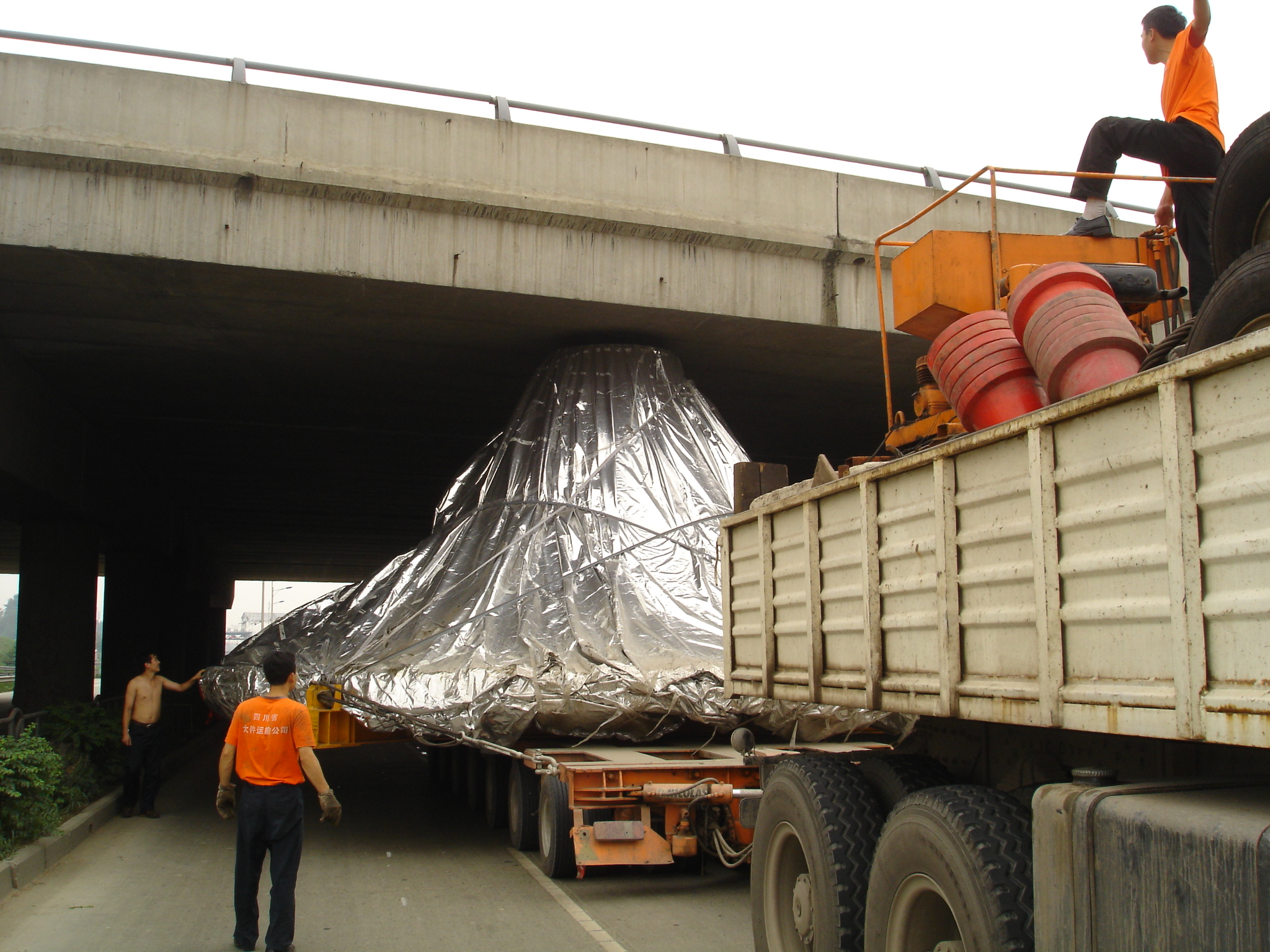 三峡水轮机转轮上冠装车运输,重109.72吨,宽8.46米。